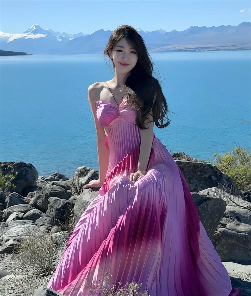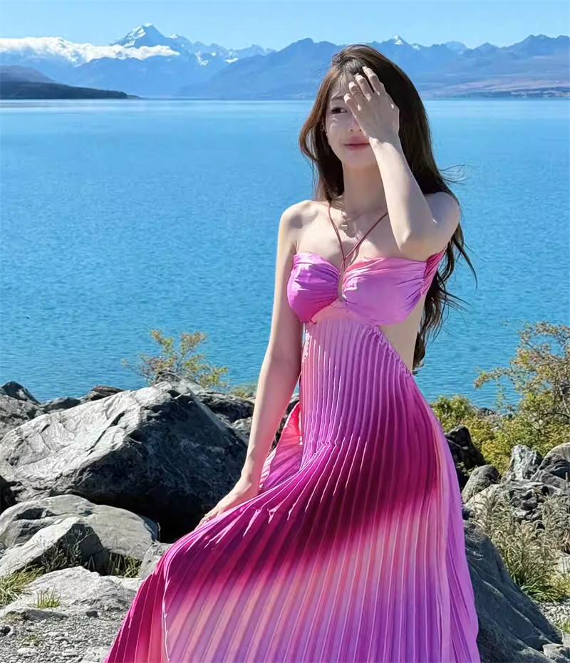 欧美风气质印花优雅修身长裙辣妹低胸露背绑带吊带连衣裙