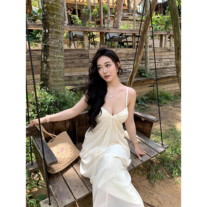肉装小cherry 甜心月神 度假风微胖自带胸垫飘逸感花朵褶皱连衣裙
