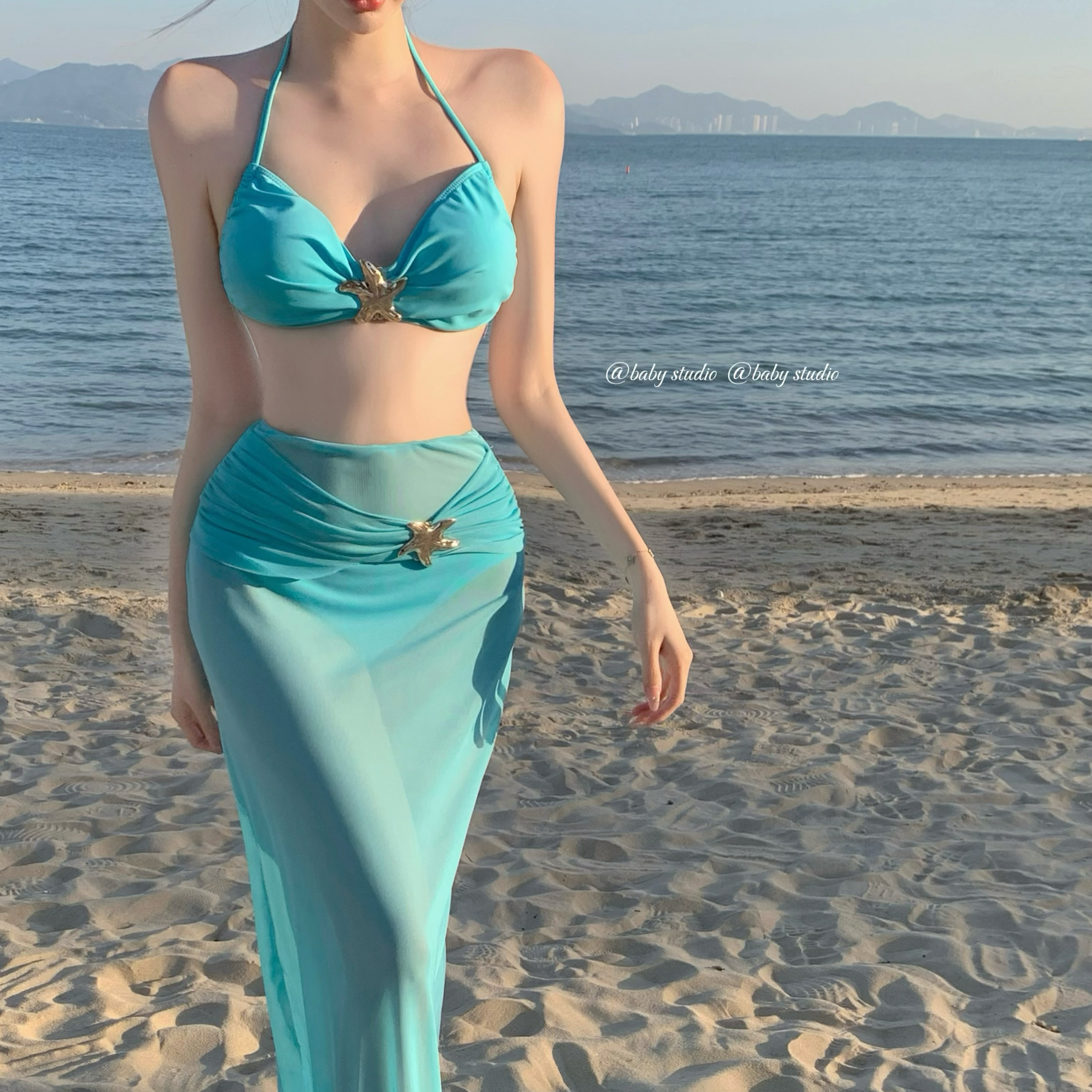 绝美长裙度假2025新款比基尼三件套纯欲风高级感性感分体泳衣女