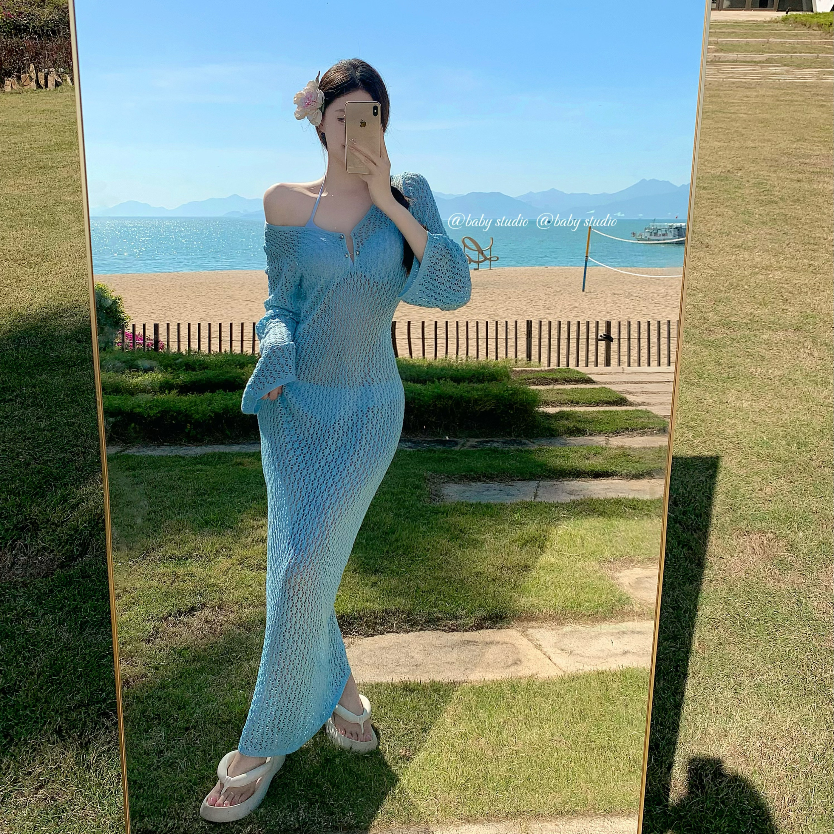 2025新款蓝薄荷ins性感镂空长裙分体泳衣女沙滩度假纯欲风泡温泉