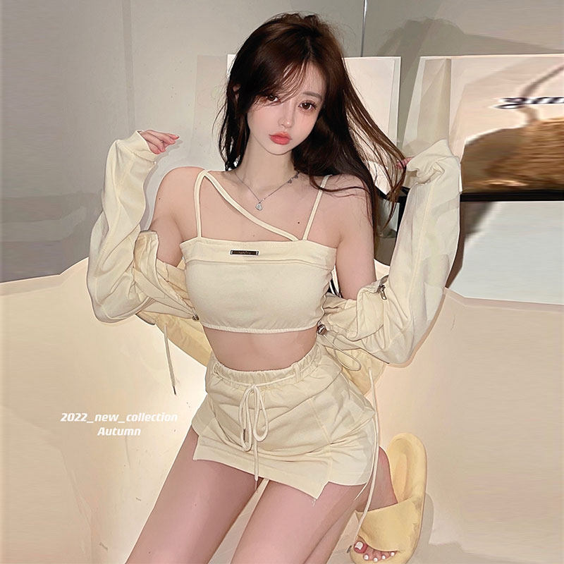 甜辣风运动套装短款连帽卫衣外套吊带背心显瘦高腰包臀短裙三件套