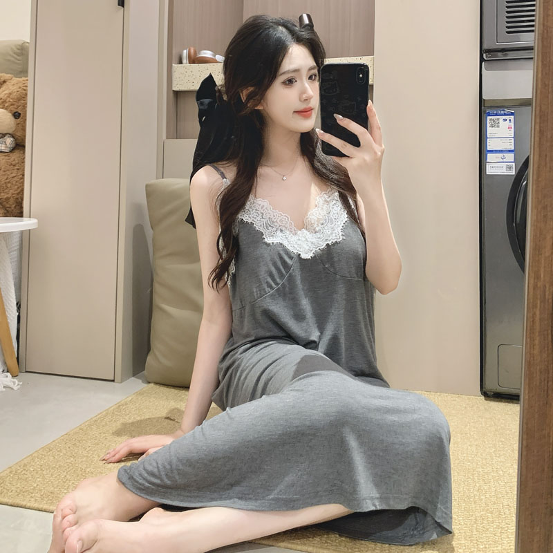 莫代尔吊带睡裙女夏季纯欲薄款性感蕾丝花边无袖带胸垫V领睡衣裙