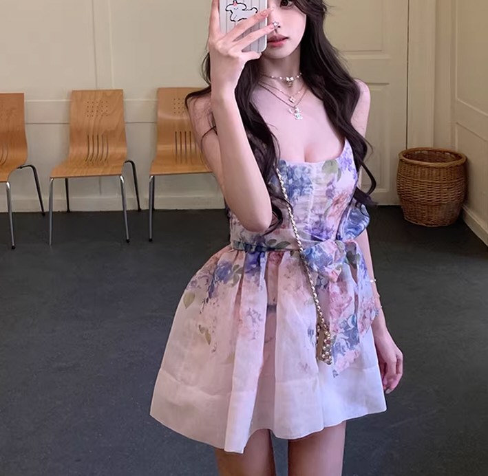扎染蝴蝶印花紫色吊带连衣裙女夏季辣妹网纱包臀短裙紧身性感裙子