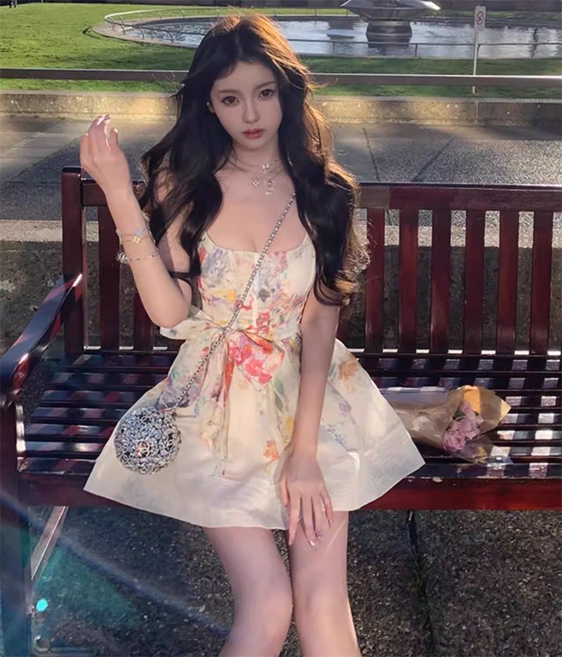 法式碎花吊带连衣裙女夏季甜辣妹复古裙子开叉风情性感显瘦中长裙