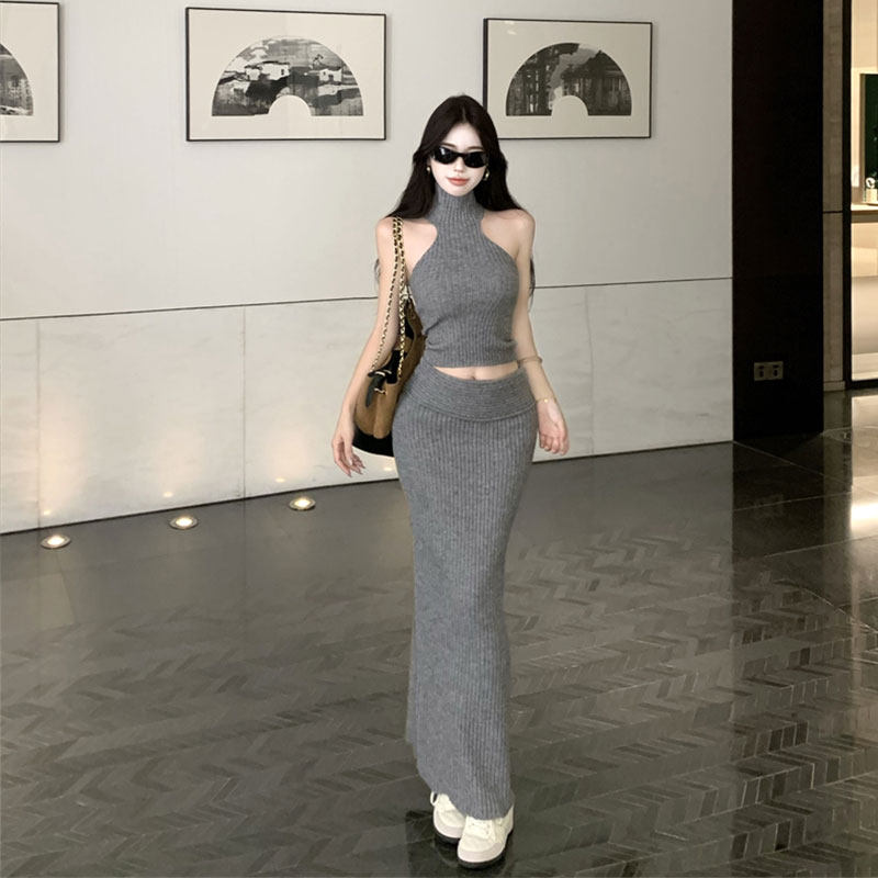 2025秋季新款纯欲辣妹性感挂脖背心吊带上衣高腰修身鱼尾裙子套装
