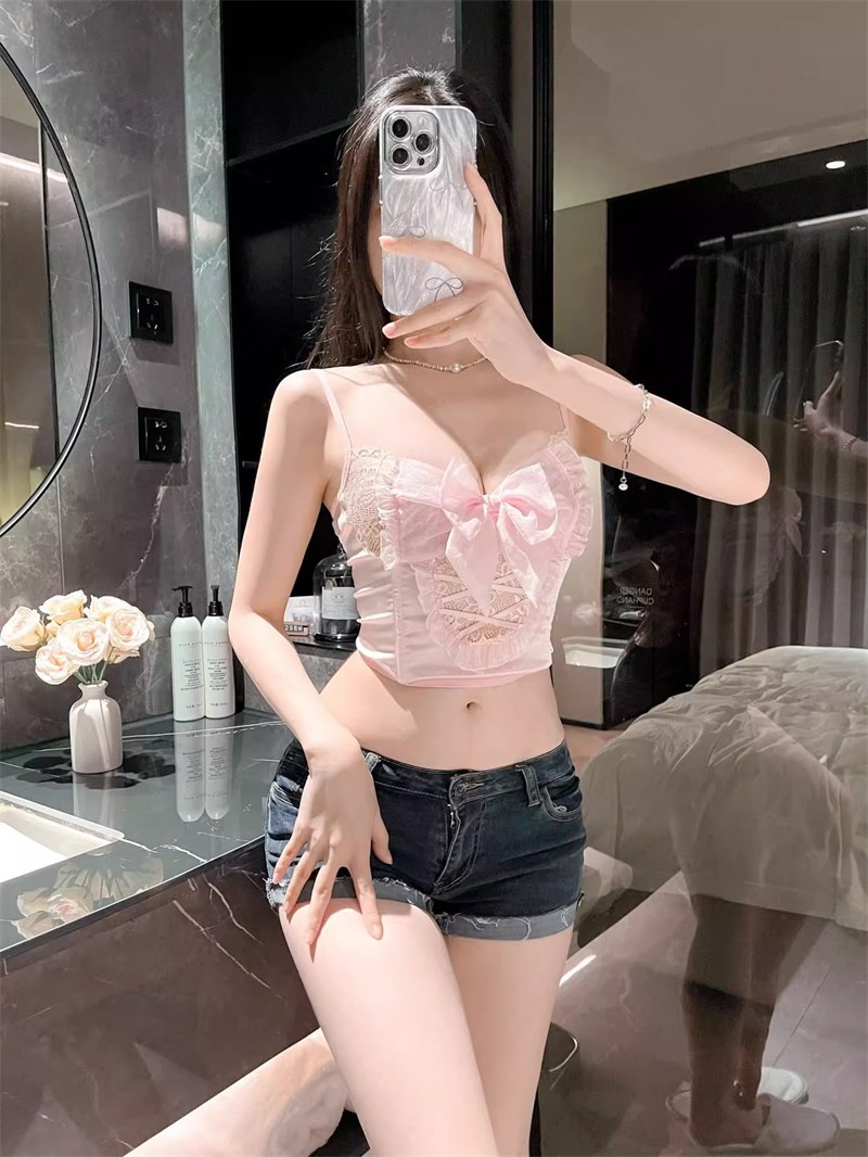 2025新款粉色甜辣妹蝴蝶结纯欲蕾丝花边一字领抹胸美背吊带马甲女
