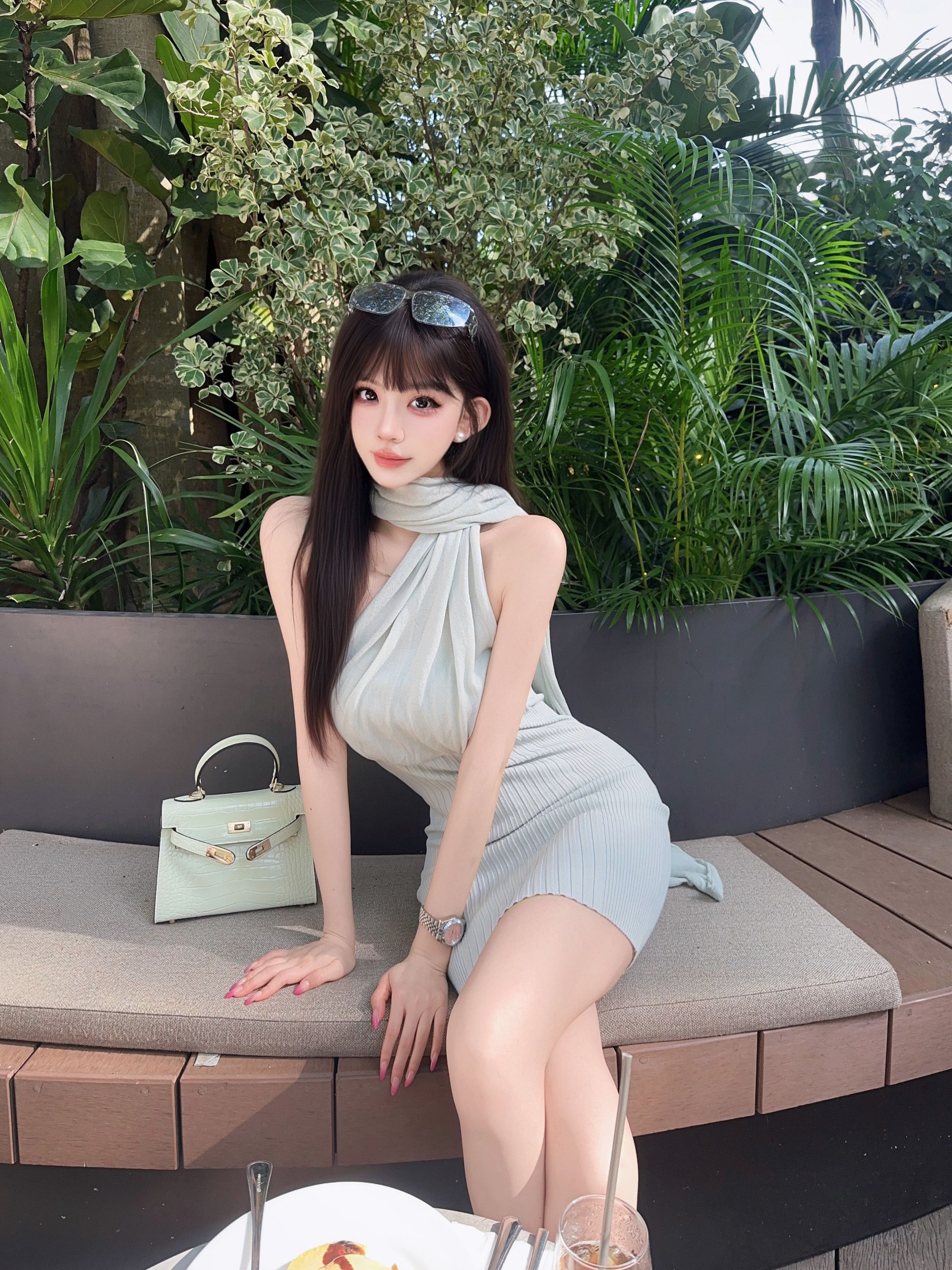 失效药丸【娇欲佳人】白色挂颈洋装女纯欲千金收腰包臀短裙子