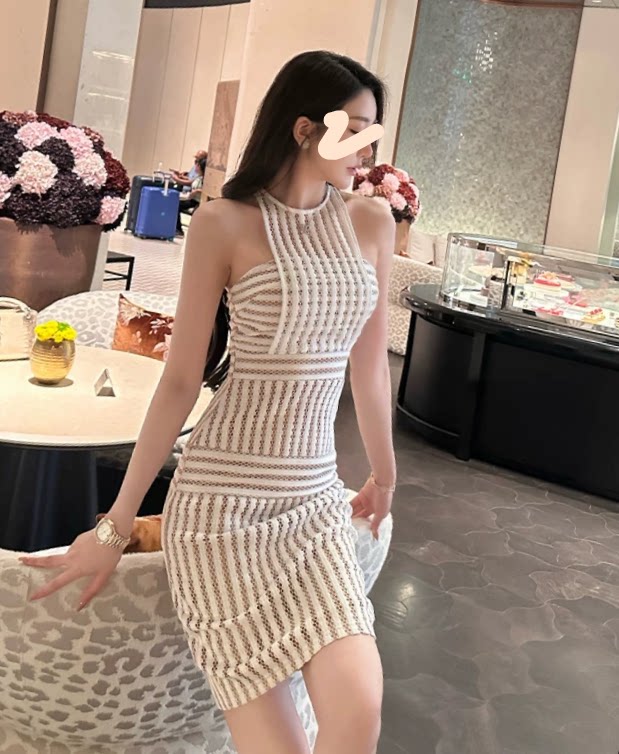 Eva君君酱韩系甜美设计感飘带挂脖针织包臀显瘦连衣裙女气质短裙