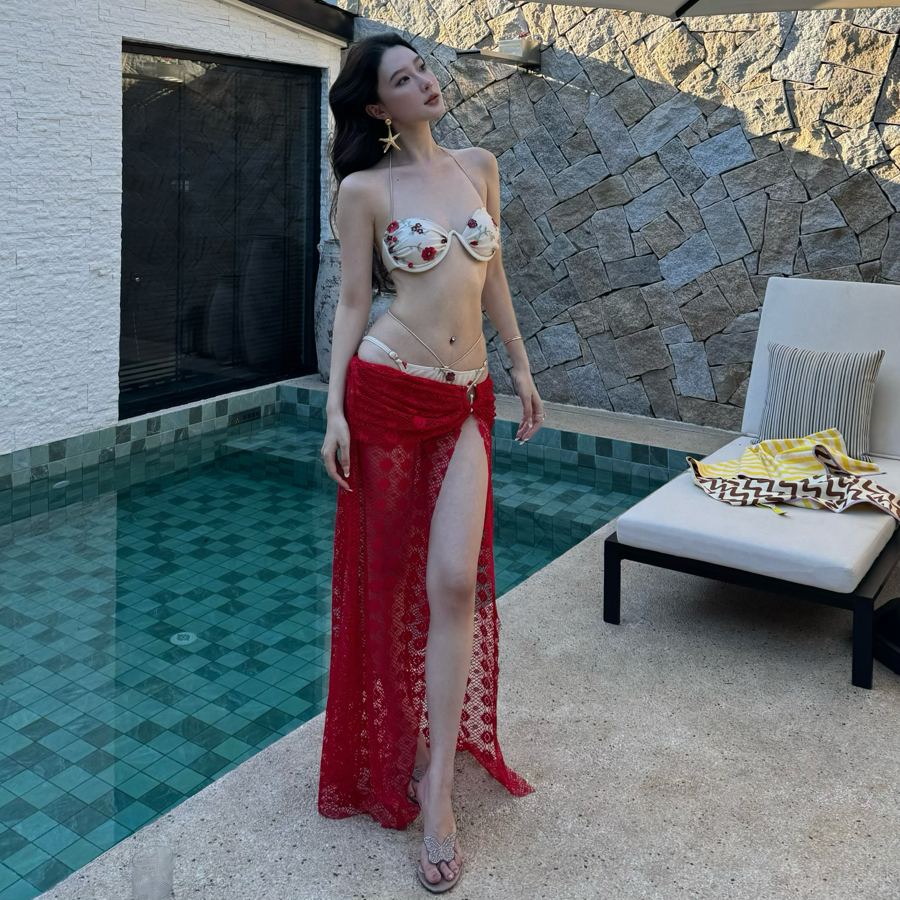 绝美长裙度假2025新款比基尼三件套纯欲风高级感性感分体泳衣女