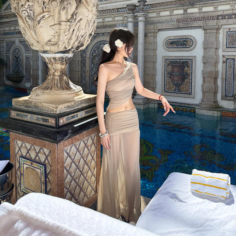 纯欲辣妹穿搭网纱套装女斜肩无袖抹胸背心+高腰开叉包臀半身裙