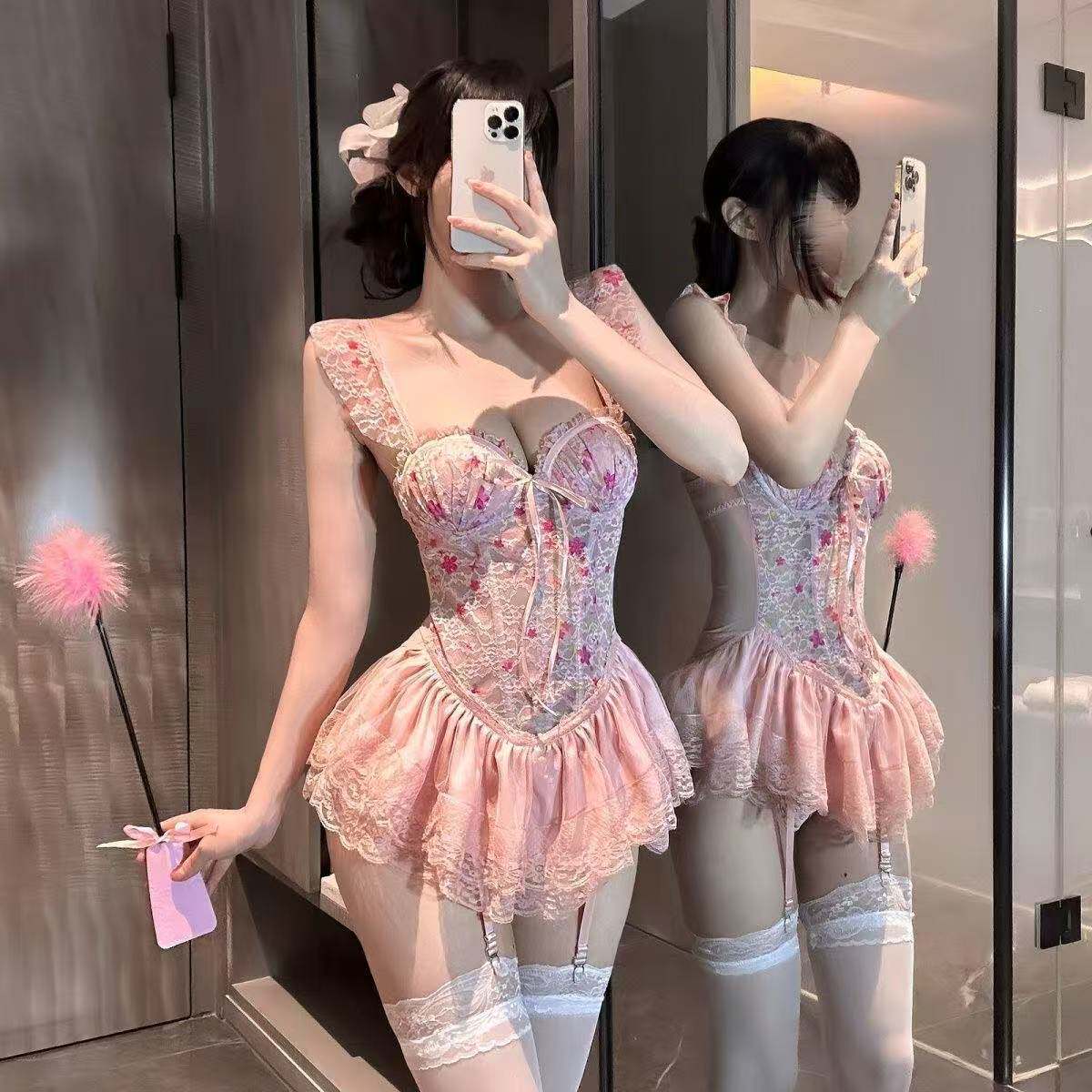若隐若现性感睡衣女夏季甜美蕾丝网纱碎花睡裙吊带纯欲大码家居服